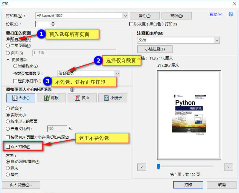 首先按奇数页正序打印,将打印出来的纸张翻转过来,再按偶数页逆序打印。